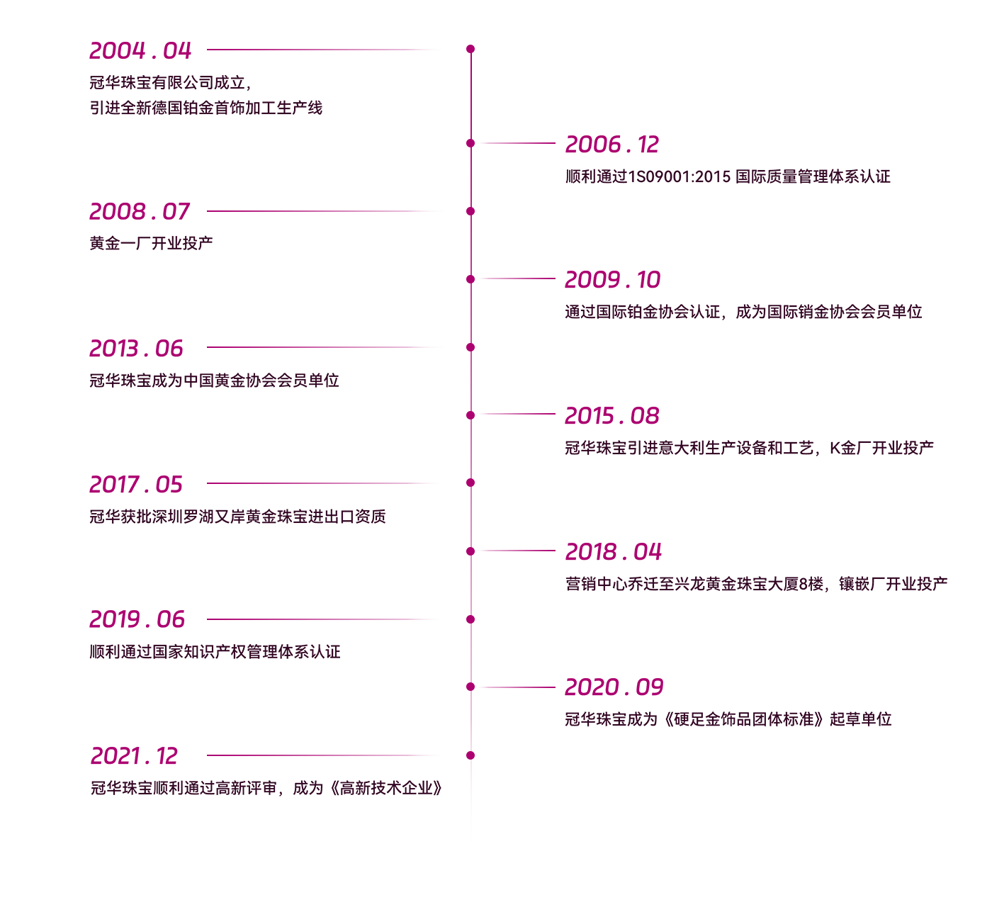 十几年来的飞速发展,我们始终不忘初心,坚持做好产品,发扬冠华人团结勤奋的蜜蜂精神,提出二次创业和赛道升级的战略思想。由原先的素金供应商向“珠宝产品整体解决方案专家”转型;我们紧跟时代步伐,跟随国家“一带一路”的总方针,成立了美国芝加哥分公司和香港分公司,引进了意大利和德国先进的生产技术和设备,以及韩国时尚的设计理念。2017年冠华获批深圳罗湖口岸贵金属进出口资质,通过香港冠华公司为中转跳板辐射东南亚、欧洲和北美等珠宝市场,成功实现了“引进来和走出去”双向并行的新模式。